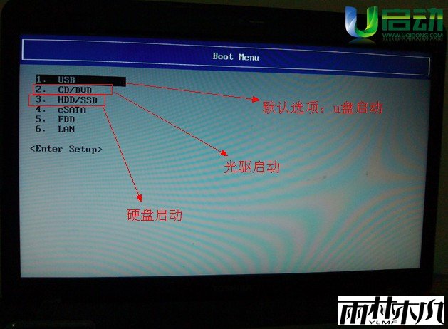 如下图所示:进入后的光标默认选择的选项是第一个“u盘启动”,可能有些人的默认第一个选项是电脑本地硬盘!