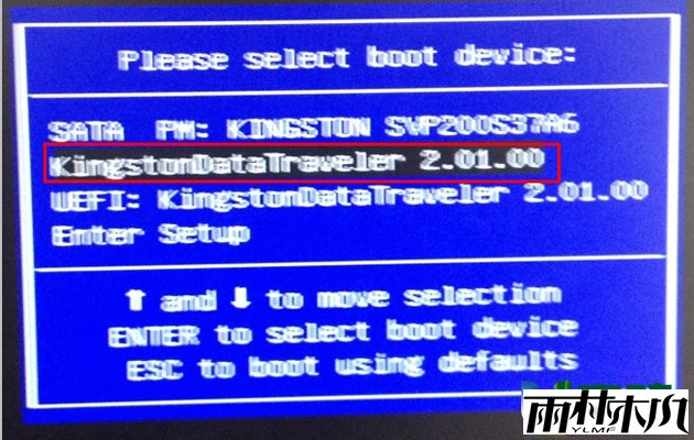 大神pe温馨提示:如果默认选项不是u盘,那么请将光标移动到标识的u盘处即可!今天小编使用的u盘是金士顿品牌的!