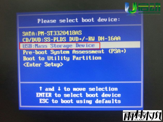 如下图所示,将光标移动选择到的地方显示“USB:Mass Storage Device”(大神pe小编写这篇教程的时候使用的是大容量存储设备)所以,当我们按下快速启动热键F12的时候显示出来的选项中就包含有小编用大神pe制作好启动盘的u盘“大容量存储设备”。