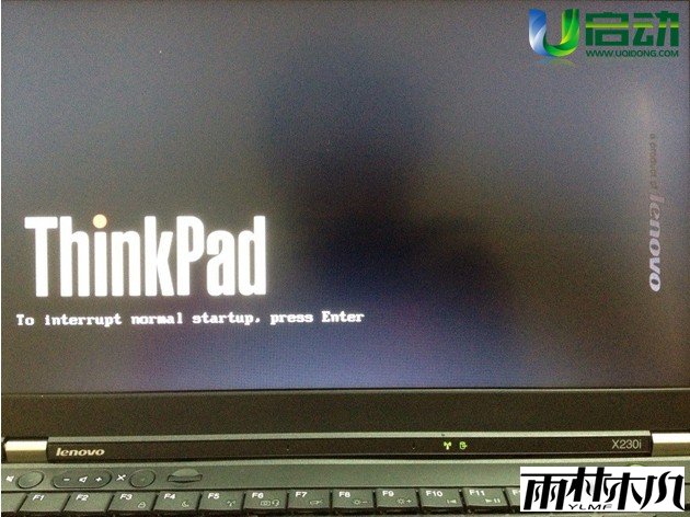 开启电脑后当看到开机画面的时候,连续按下键盘上的"F12"键,如下图所示:为联想Thinkpad笔记本开机的画面。
