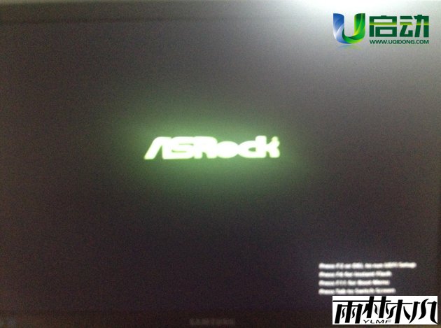开启电脑后当看到开机画面的时候,连续按下键盘上的"F11"键,如下图所示:为华擎主板组装电脑开机的画面。