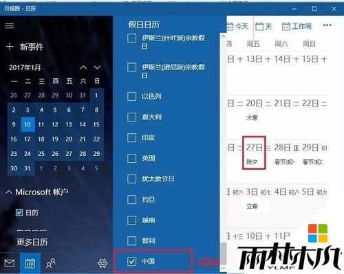 3、然后在更多日历设置中,勾选上“中国”,之后在右侧的日历中,就可以看到“春节”等农历的二十节气信息了,其中可以看到一些农历信息,如图所示。
