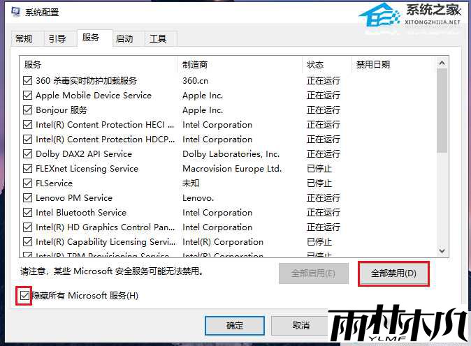 步骤2:下面,在【服务项目】标识下,寻找并启用【掩藏全部Microsoft服务项目】选择项,以后按下【所有禁止使用】按键。