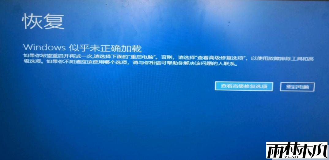 有一位雨林木风官网的小伙伴,反馈说他昨天还好好的用着的win10专业版系统,今天突然就无法打开了,还出现蓝屏恢复界面,提示Windows似乎没有正确加载,而且重启计算机也不起作用,那如何解决这个问题呢?本文中,ylmf系统小编就为大家分享详细的处理方法,有需要的小伙伴可以看看参考一下。