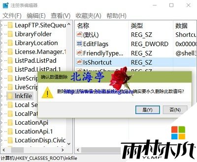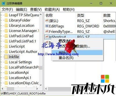 第二步、在注册表编辑器窗口,依次展开并定位至HKEY_CLASSES_ROOT\lnkfile,然后在右侧窗口找到并右键删除名称为lsShortcut的字符串值