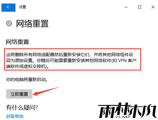 4、网络重置(注意说明),确定没问题后,点击 立即重置 即可;