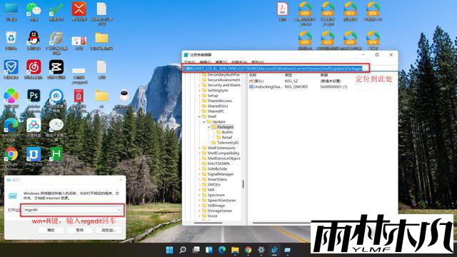 3、把“计算机\HKEY_LOCAL_MACHINE\SOFTWARE\Microsoft\Windows\CurrentVersion\Shell\Update\Packages”复制到
