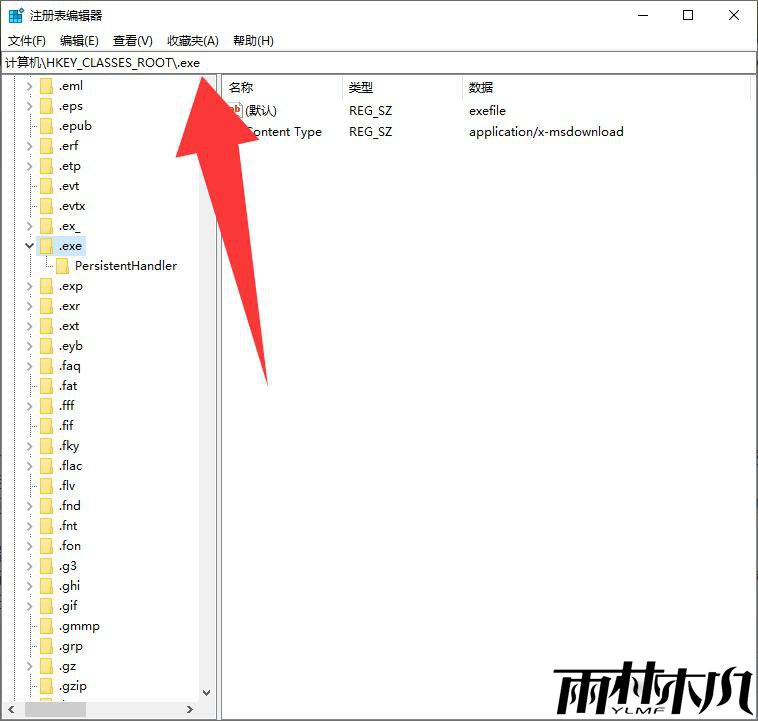 在注册表编辑器中,依次展开以下路径:HKEY_CLASSES_ROOT\.exe。