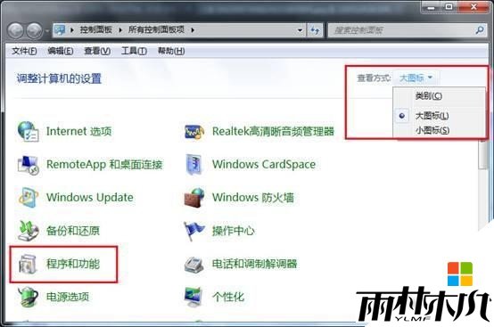 2、打开控制面板后,将查看方式修改为“大图标”,然后点击“程序和功能”,如下图所示: