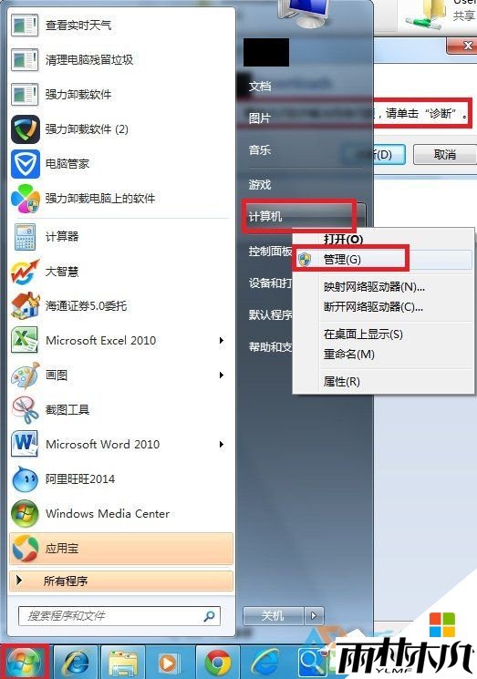 2、那怎么检查呢?点击开始,右键点击计算机,选择管理。