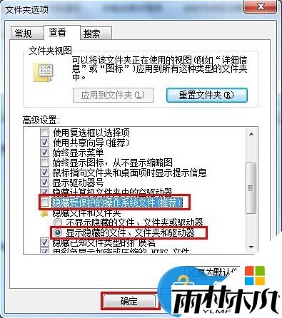 接着将电脑上的“隐藏受保护的操作系统文件( 推荐 )”前面的勾取消,然后再将”显示隐藏的文件、文件夹和驱动器“勾上即可。如下图所示。
