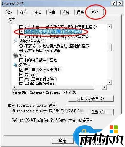 6、打开【Internet选项】——单击“高级”——选中“允许运行或安装软件,即使签名无效”。