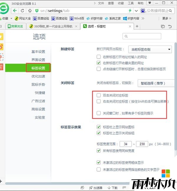4、“选项”设置里选择“标签设置”,在对应的右侧关闭标签下拉列表里所有的选项里的“勾”都取消,就好了。