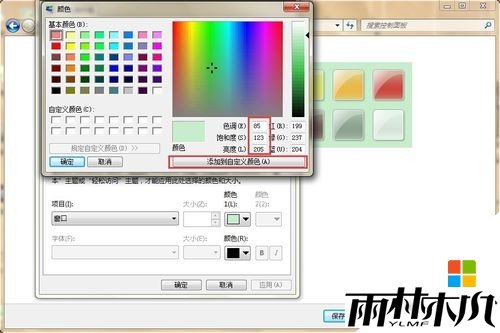 弹出的新框设置颜色:色调【85】饱和度【123】亮度【205】,点击【添加到自定义颜色】