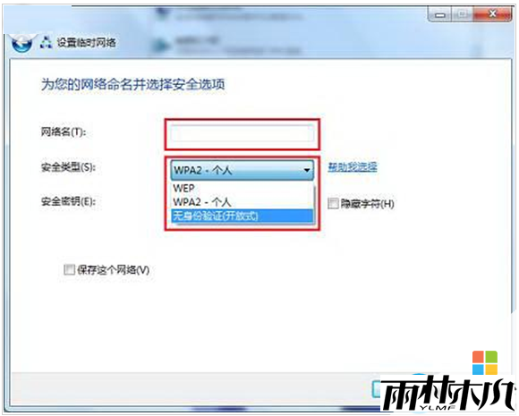 4、给自己创建的网络进行命名,然后选择合适的安全类型,如图: