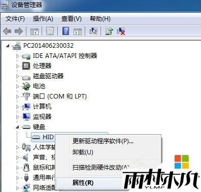 步骤五:点击一下键盘前面的小三角形符号,可以看到键盘下面的对应驱动,在该驱动上通过鼠标右键单击一下,选择属性项,打开键盘驱动更新页。