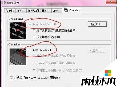 选择最后的选项卡,UltraNav,如果想使用小红帽就勾选上面的选项,如果想使用触摸板就勾选下面的选项。如果不勾选,则相应的功能被关闭。如下所所示: