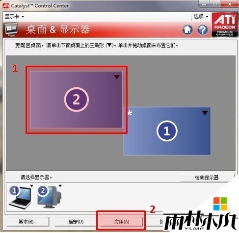 出现下图,将鼠标指针移到要调整的显示设备上面,如下图中的2#(第二显示器),光标即变为“十字”状,然后按住鼠标左键不动拖动到自己需要的相对于1#(主显示器)的位置,然后松开鼠标左键,单击“应用”即可