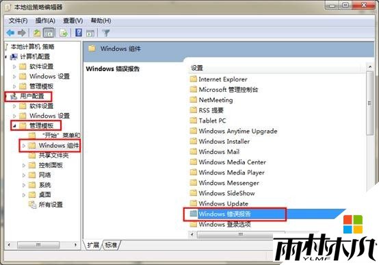 2、依次点开“用户配置”——“管理模板”——“Windows组件”——“Windows错误报告”选项;