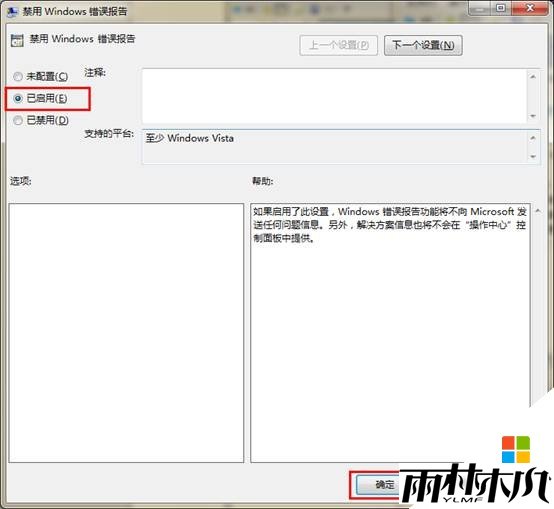 3、 双点“Windows错误报告”登进“禁用Windows错误报告”页面,在其中咱们选定“启用”状态点“确定”键值就可以了。
