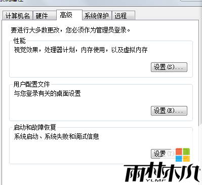 3.在系统属性窗口中,咱们将界面切换到高级这一栏,然后找到下方的“启动和故障恢复”,之点击它后面的设置按钮。