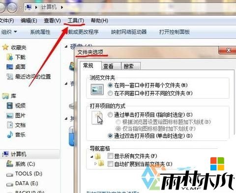 首先打开我的计算机,然后点击“工具”---“文件夹选项”,选择“查看”
