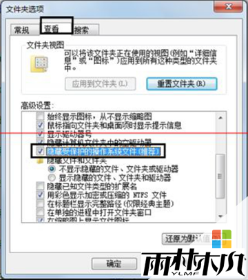 2、切换到“查看”标签页,找到“显示所有隐藏文件和文件夹”,去掉“隐藏受保护的系统文件”的勾选。