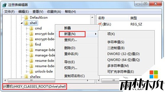 2、在打开的注册表编辑器窗口中,依次点击展开左侧菜单中的HKEY_CLASSES_ROOTDriveshell,然后右键点击shell文件,接着在左侧窗口中新建分支,命名为runas;将右方窗口中的Default值修改为Defragment,再在右边窗口中新建名为Extended的键值即可。