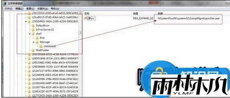 4、同样方法开发注册表编辑器,定位到HKEY_LOCAL_MACHINESOFTWAREClassesCLSID{20D04FE0-3AEA-1069-A2D8-08002B30309D}shellManagecommand,将右窗格中的“默认”键值(双击打开)修改为mmc.exe %windir%system32compmgmt.msc 。关闭注册表编辑器,此时“管理”应该可以打开了,此方法可以修复由于CompMgmtLauncher.exe 调用失效所引起的“管理”打不开,此时系统将直接调用compmgmt.msc而不是CompMgmtLauncher.exe。