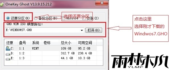 4、在Onekey ghost选择还原分区,在GHO WIM ISO映像路径中选择刚才下载的Win7系统镜像Windows7.GHO,见下图。