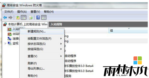 1首先在开始菜单的搜索框中输入“高级安全windows防火墙”,然后打开它,接着鼠标右击入站规则选择“新建规则”项;
