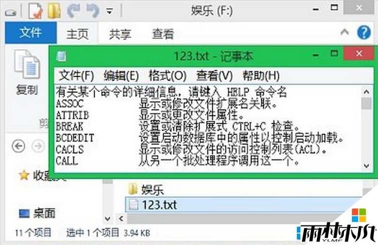 二、在出现的命令提示符窗口,输入“help>f:\123.txt”后回车。
