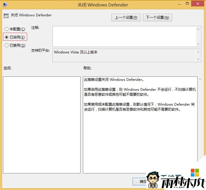 6、关闭Windows Defender设置页,选择“已启用”,然后点击应用设置即可完成。