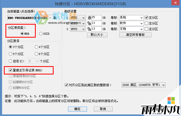 12、转换完成后,执行快速分区,分区大小几磁盘个数自己选择,确保分区表类型为MbR ,及勾选了重建主引导记录MBR,按下确定后开始分区;