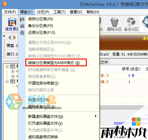 11、删除分区后,装换硬盘分区表类型 为 MBR 格式,同样还是从“硬盘”——“转换分区表类型为MBR格式”,然后保存更改(以下为图示,此时该项为可点,如不可点说明已经转换好了。)