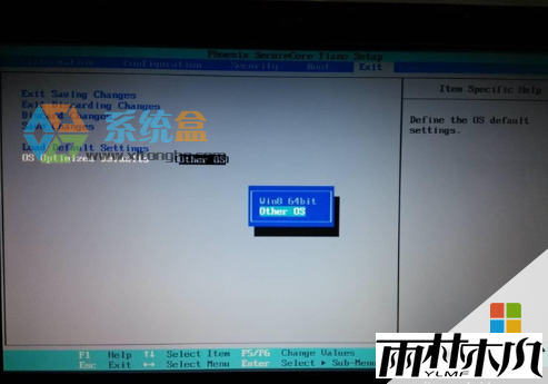 2、开机进入BIOS后,方向键选到 exit 界面 将OS Optimized Default 改成Other OS(上下键选择,回车确定);