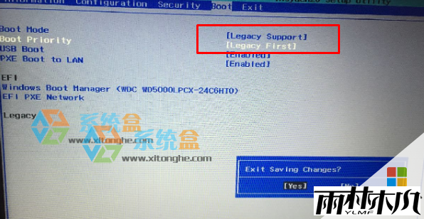 3、然后再使用左右方向到Boot界面,Boot”项目中的“BootMode”系统默认设置是“UEFI”要将其改为“Legacy Support”,“Boot Priorlty”也要更改为 “LegacyFirst”这样更改就是跟之前那些没有带系统出厂的一样了xitonghe.com;