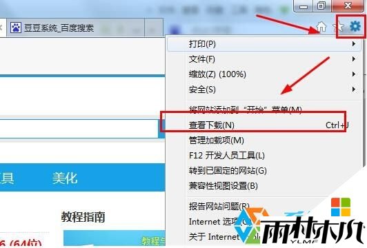 1、在win8.1专业版系统桌面打开IE浏览器,然后点击“设置”菜单中的“查看下载”;(右上角齿轮图标,如下);