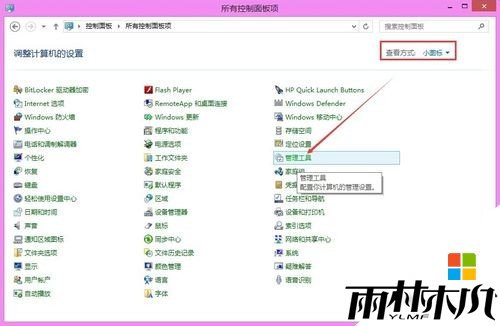 在打开的win8.1系统控制面板里,选择查看方式为小图标,然后找到管理工具,如下图所示。