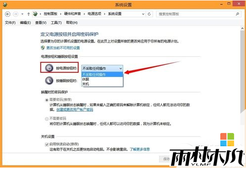 3.然后我们把按电源按钮时后面的框框改成不采取任何操作!
