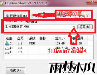 选择还原分区(基本为c盘),选择你的安装系统包,win7
