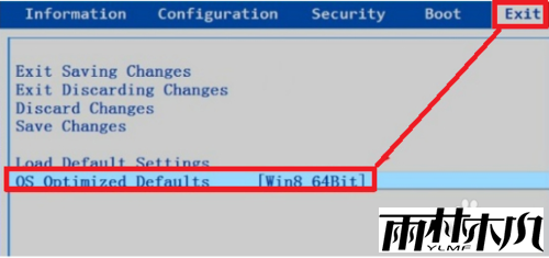 以下图所示,先按左右”←→“键将光标移至“Exit”选项处,再按高低键挑选到“OS Optimized Defaults [win8 64Bit]”处,按回键,将[]里面的“win8 64Bit”换成“disabled”