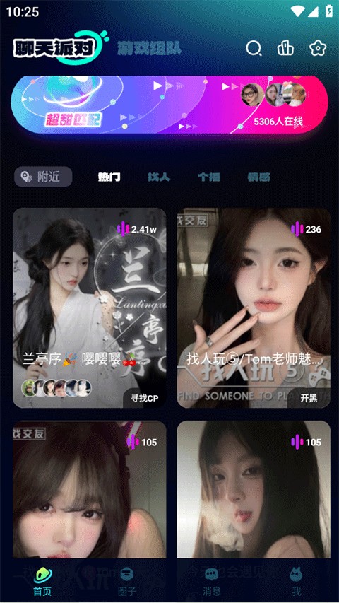 5、切换至「圈子」页面,这里堪称社交宝藏地:动态广场实时刷新着用户的游戏战绩、语音段子;话题专区按「恋爱交友」「游戏攻略」等分类呈现;更可参与「语音接龙」「猜歌大赛」等互动游戏,轻松积累社交积分兑换限定头像框。